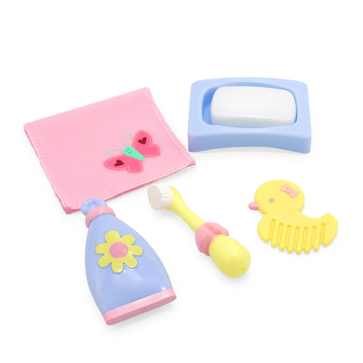 Looking for doll accessories for your baby doll this Bathtime Play Set is perfect. 7 PIECE SET includes bathtub, pretend soap dish, soap, rubber ducky, toothpaste, toothbrush and cute ducky comb