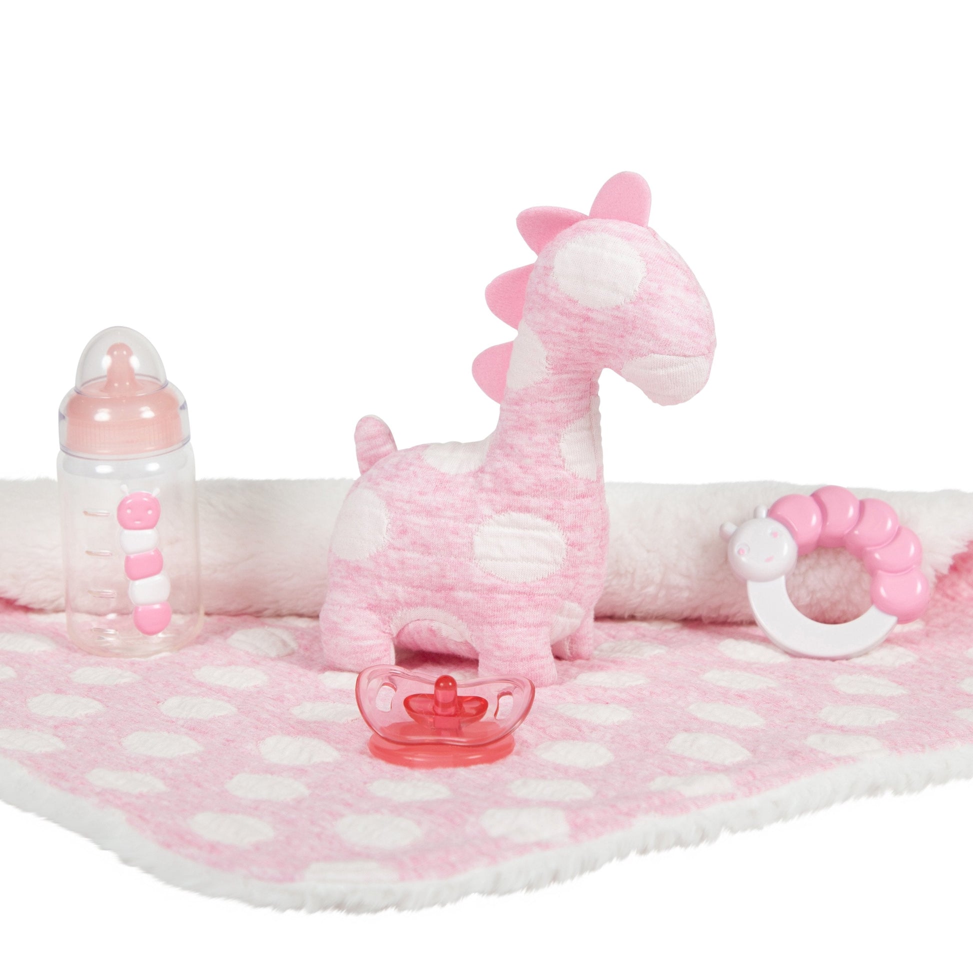 11 piece gift set includes doll, outfit, booties, headband, blanket, plush Dino, hospital bracelet, pacifier, bottle, rattle, and birth Certificate