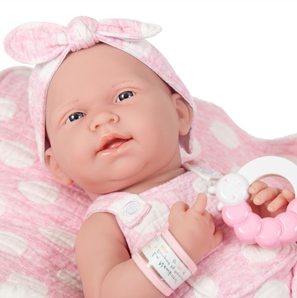 The La Newborn Collection of Real Life Baby dolls introduces its newest addition. Dressed in a charming Pink Polka Dot Onesie set and matching Blanket, our La Newborn is as adorable as can be. This precious La Newborn features an adorable expression and striking baby blue eyes that are sure to melt your heart! She is a 15 inches all-vinyl Anatomically Correct “Real Girl” with moveable arms, legs, and head. She is made completely out of vinyl for easy care. This sweet little girl is all dressed up in a cute pink overall onesie with matching bow headband and matching booties. She is all bundled up in her soft pink and white blanket so she can cuddle up with her pet Dinosaur.